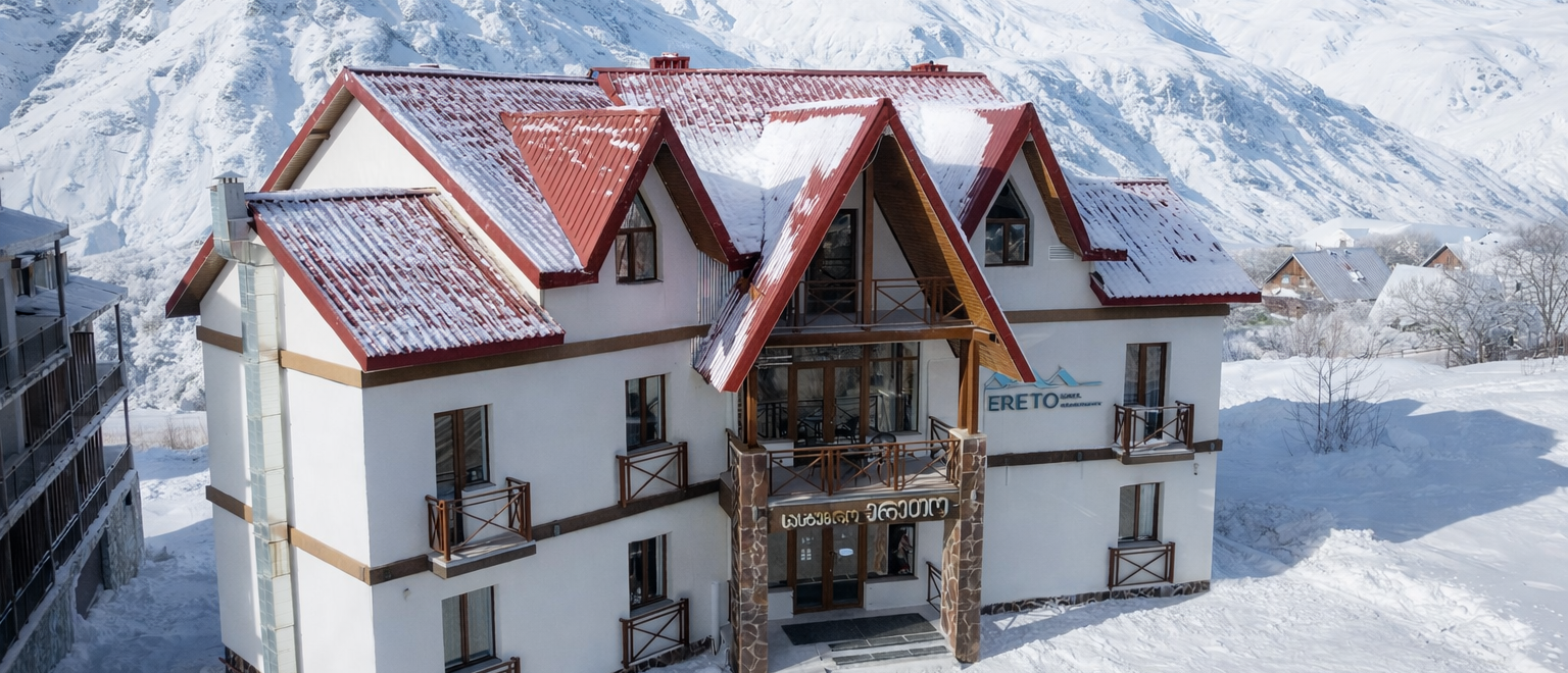 Уютный отель Ereto, управляемый компанией Snow Time, расположен на горнолыжном курорте Гудаури, всего в 500 метрах от первого подъемника в центральном Гудаури за зданием полиции. Из отеля открываются захватывающие виды на горы. В пешей доступности находятся бары, рестораны, супермаркеты, спа-центры, банкоматы, пункты обмена валюты и медицинский центр.
