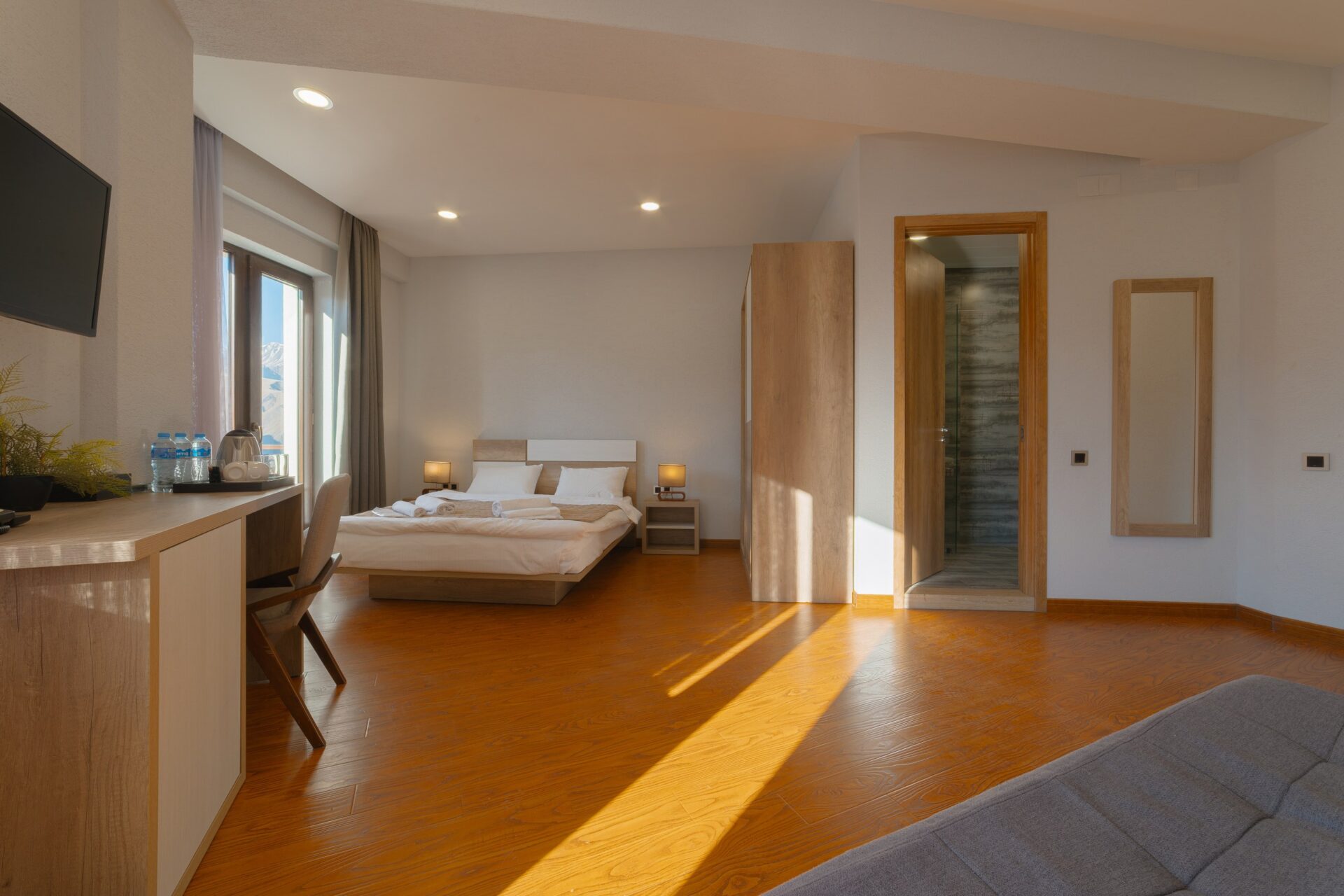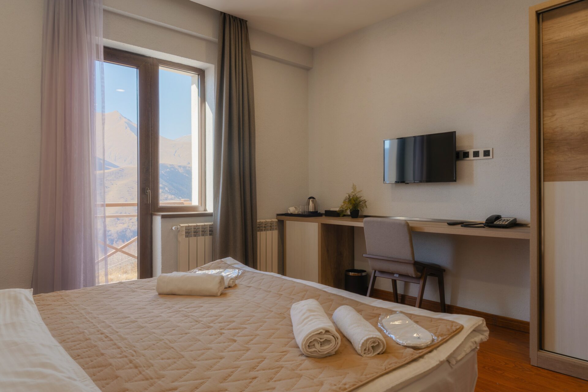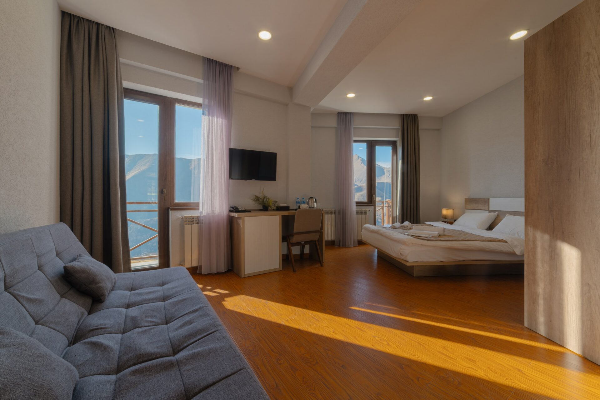 Отель предлагает 18 номеров, рассчитанных на 41 гостя и 10 дополнительных мест. Каждый номер оснащён панорамными окнами с видом на горы.